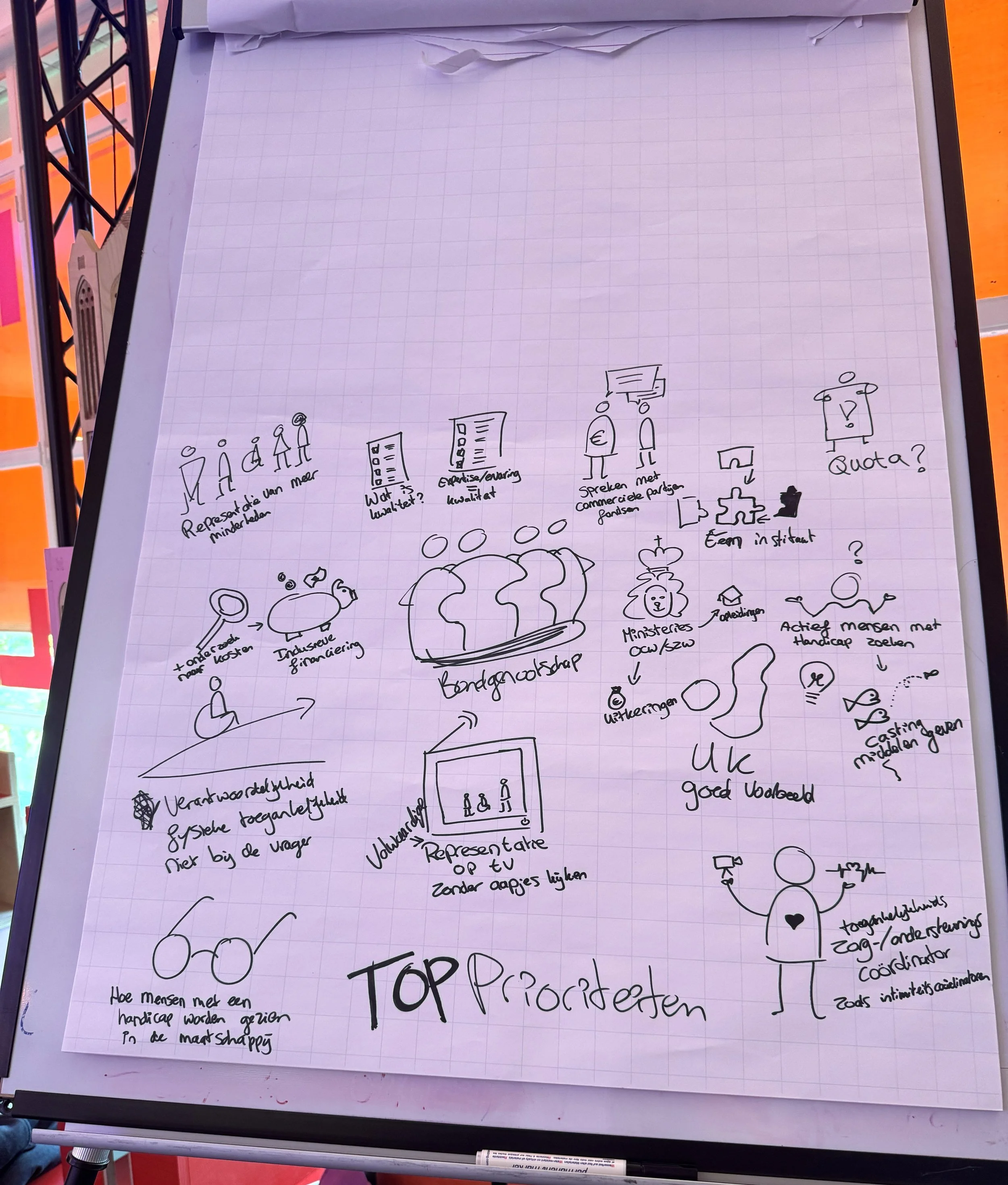 Bij binnenkomst zorgen communicado’s Jiska en Gabriëlle voor het welkom, al snel aangevuld met Solange. Terwijl Jiska en Solange gepersonaliseerde naamkaartjes tekenen, voorziet Gabriëlle de gasten van consumptiebonnen en wijst de weg naar de lunch en het podium. Iedereen is er: de cast van de NPO-serie Handicapable, de lichting nieuw talent, het brede partnernetwerk van PACT MEDIA – van opleidingen en omroepen tot zorginstellingen en festival. Allen druk met elkaar in gesprek want samen openen we de weg naar een inclusieve sector. Het officiële programma begint met prachtige live muziek van Ties Mellema op saxofoon. De zaal is in een mum van tijd stil en luistert ademloos. Dan neemt Jiska het woord, zij leidt vandaag het programma. We bekijken een filmpje van talent Roos over de ontwikkeling van haar rol, met geluid over hoofdtelefoons om te compenseren voor de beperkte geluidsinstallatie. De creatieve oplossing zorgt voor bijzondere beelden die ons bijblijven. Ook artistiek leider Mari verschijnt op het scherm; hij maakt vandaag de Rotterdamse metro’s onveilig met de opnames voor zijn film Get up Stand up.